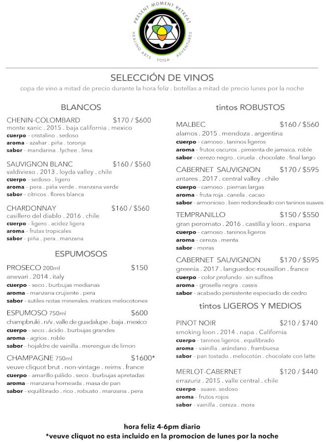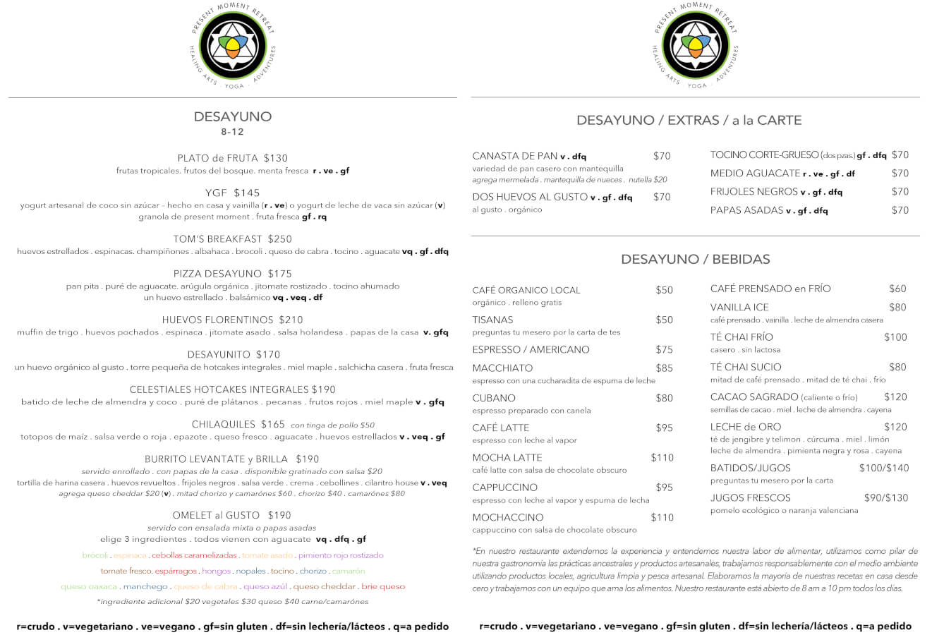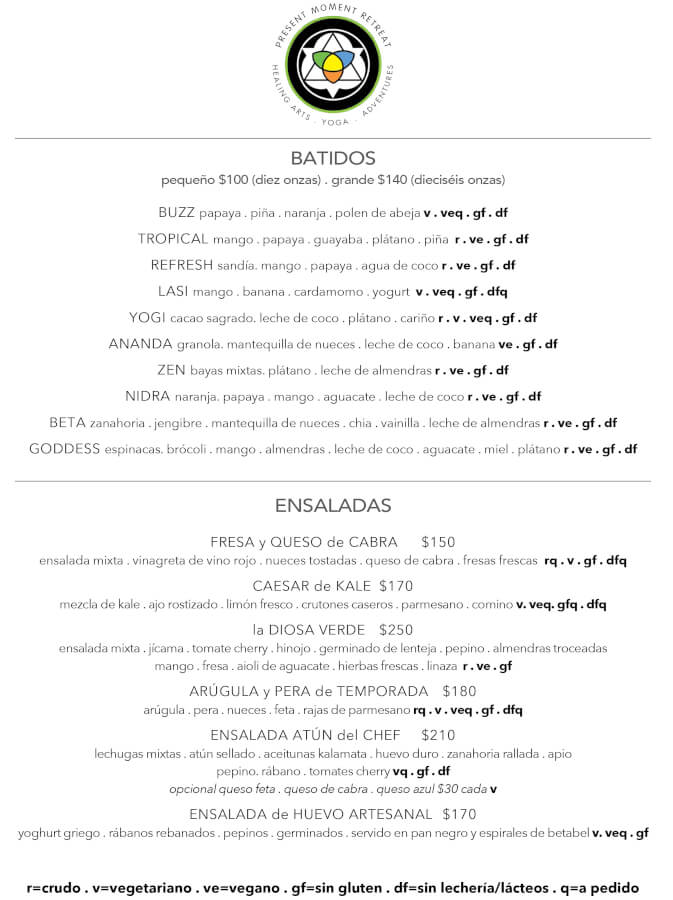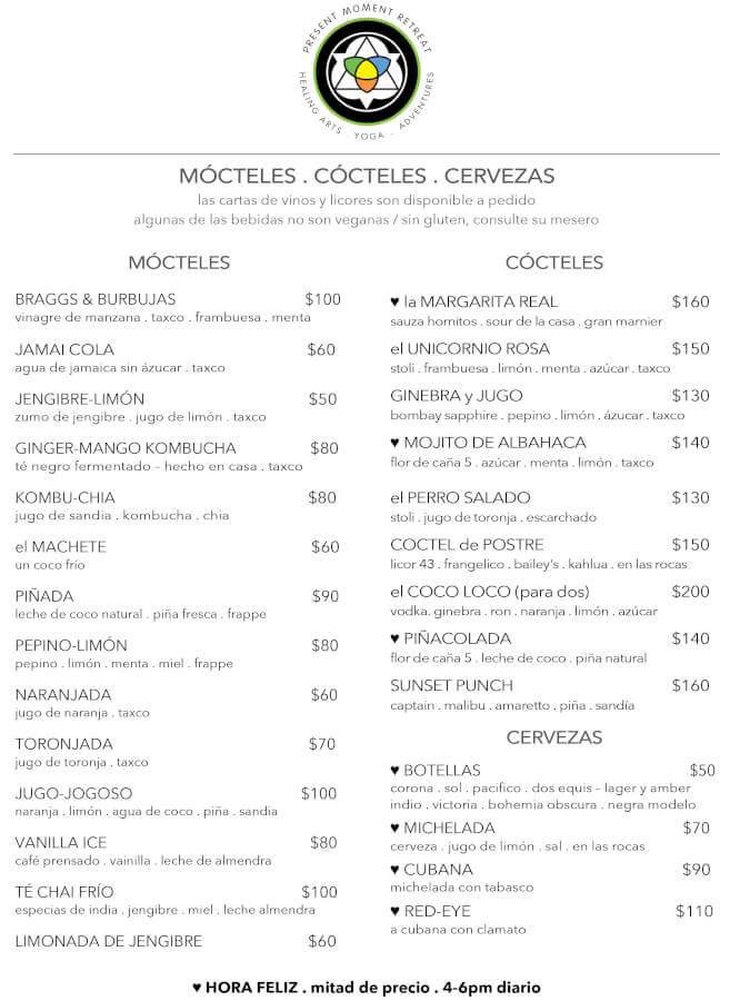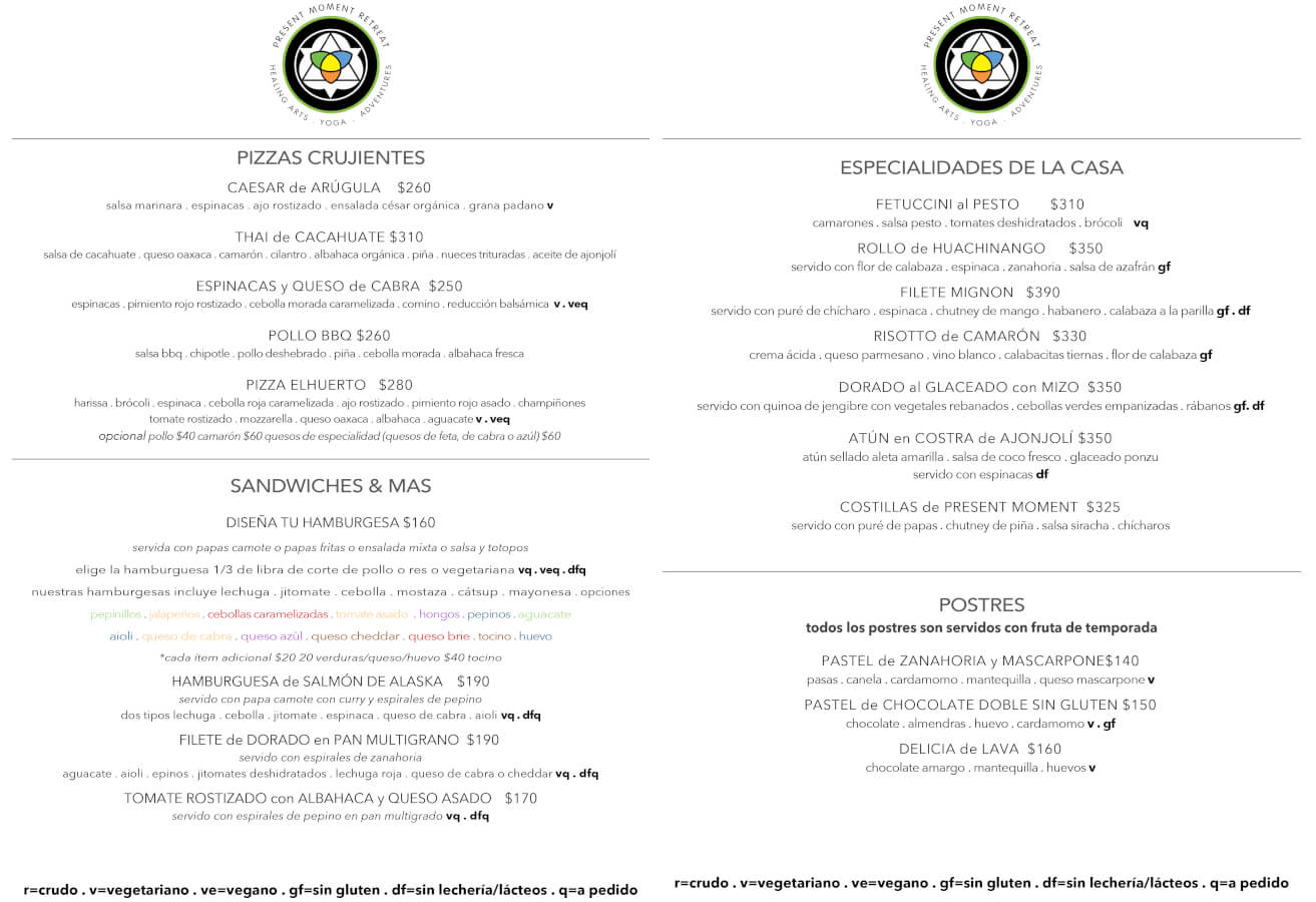 La cocina saludable de present moment es una deliciosa fusión estilo intercontinental, con pescados y mariscos frescos del mar, especialidades vegetarianas, platillos regionales latinoamericanos, delicias asiáticas, postres hechos en casa, también contamos con una gran variedad de smoothies y elixires hidratantes y con mucho gusto creamos platillos especiales para nuestros huéspedes que siguen programas de desintoxicación o de dietas específicas, nuestro restaurante tiene dos niveles, uno directo a nivel de la arena y el otro en una terraza de madera justo sobre la playa. Visite nuestra galería para disfrutar de nuestros deliciosos platillos, descubre nuestros menús actuales, abierto de 8am a 10pm
